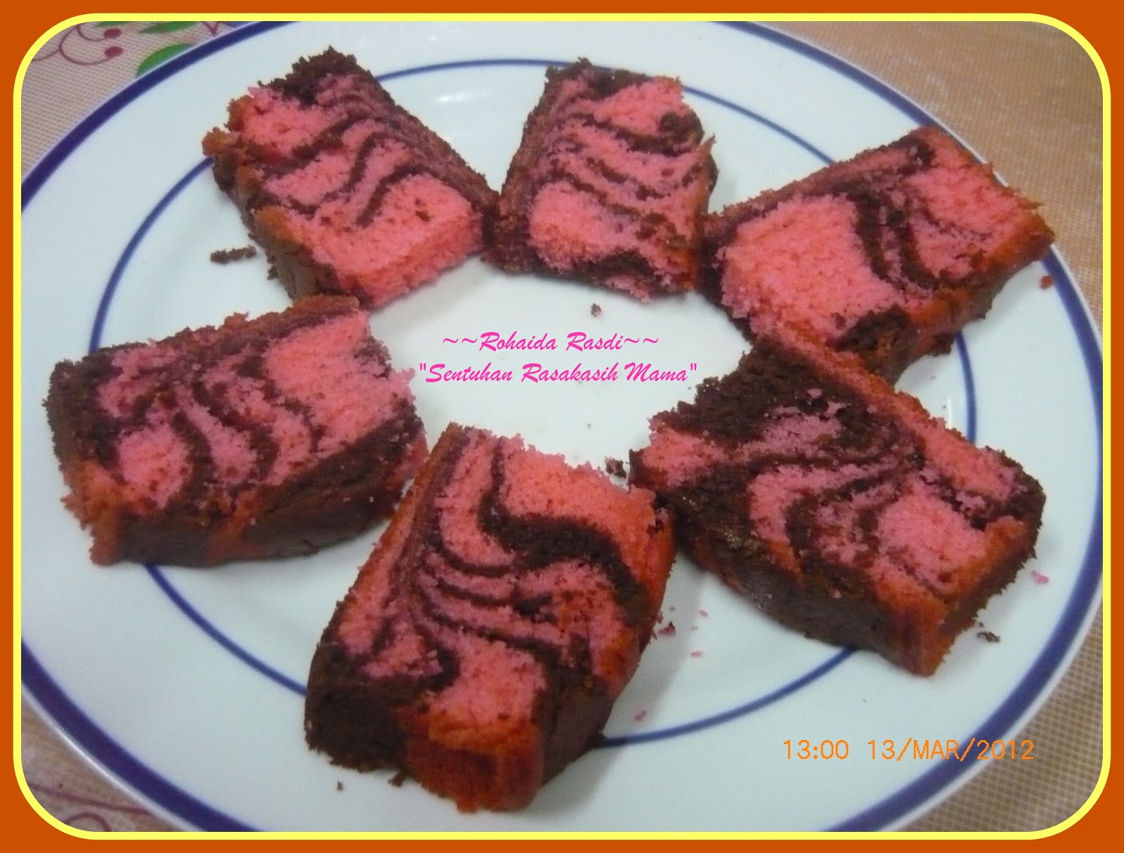 - Bahagikan adunan kepada 3 warna. Warna asal, chocolate & merah. Kemudian tuang adunan kek sesenduk demi sesenduk & buatlah effect marble dgn lidi dibakar hingga masak.